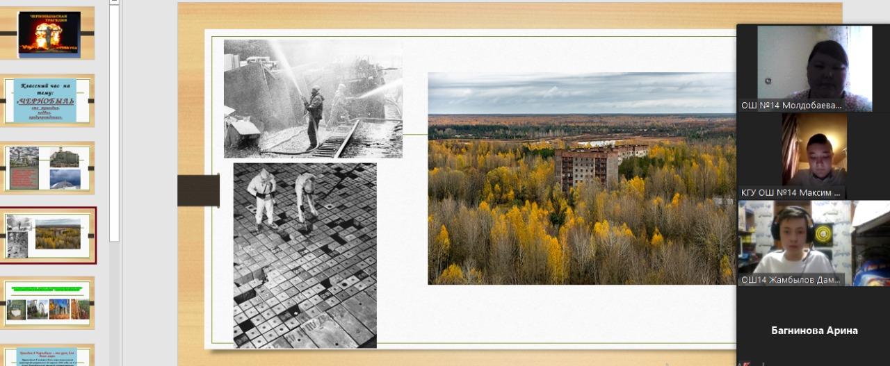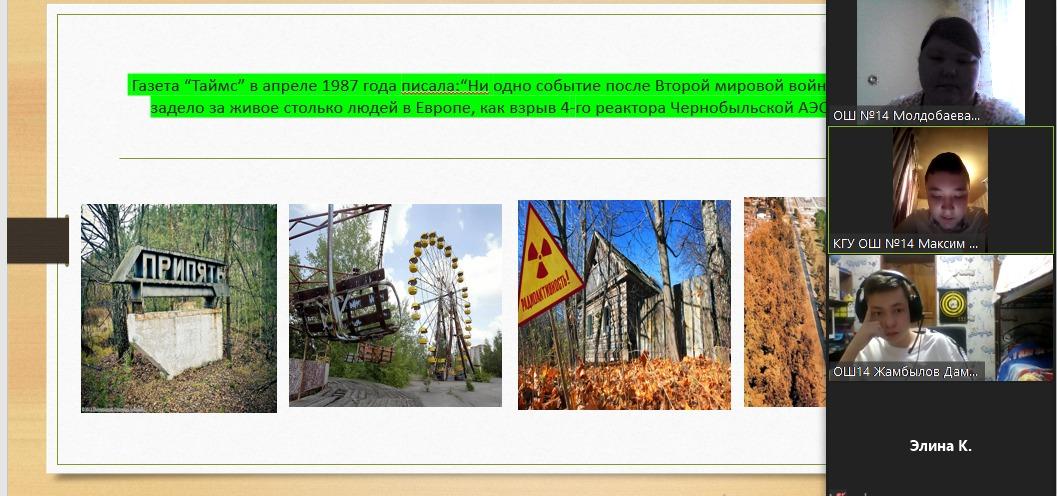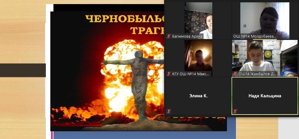 26.04.21 г. Классные руководители школы и учитель истории Молдабаева К.Ш. провели единый классный час на тему: Чернобыль- трагедия, подвиг, предупреждение. 26 апреля – Международный день памяти жертв радиационных аварий и катастроф. История атомной энергетики делится на два периода: до апреля 1986 года и после, когда за несколько коротких часов слово «Чернобыль» стало символом того, к какой трагедии могут привести ошибки при использовании ядерной энергии. Два мощных взрыва на четвёртом энергоблоке, произошедших на Чернобыльской АЭС 26 апреля 1986 года в 1 час 23 мин 49 сек, потрясли весь мир. Миллионы человеческих жизней были втянуты в водоворот этой трагедии. Этот день всегда будет объединять всех живущих одним воспоминанием, одной печалью, одной надеждой.