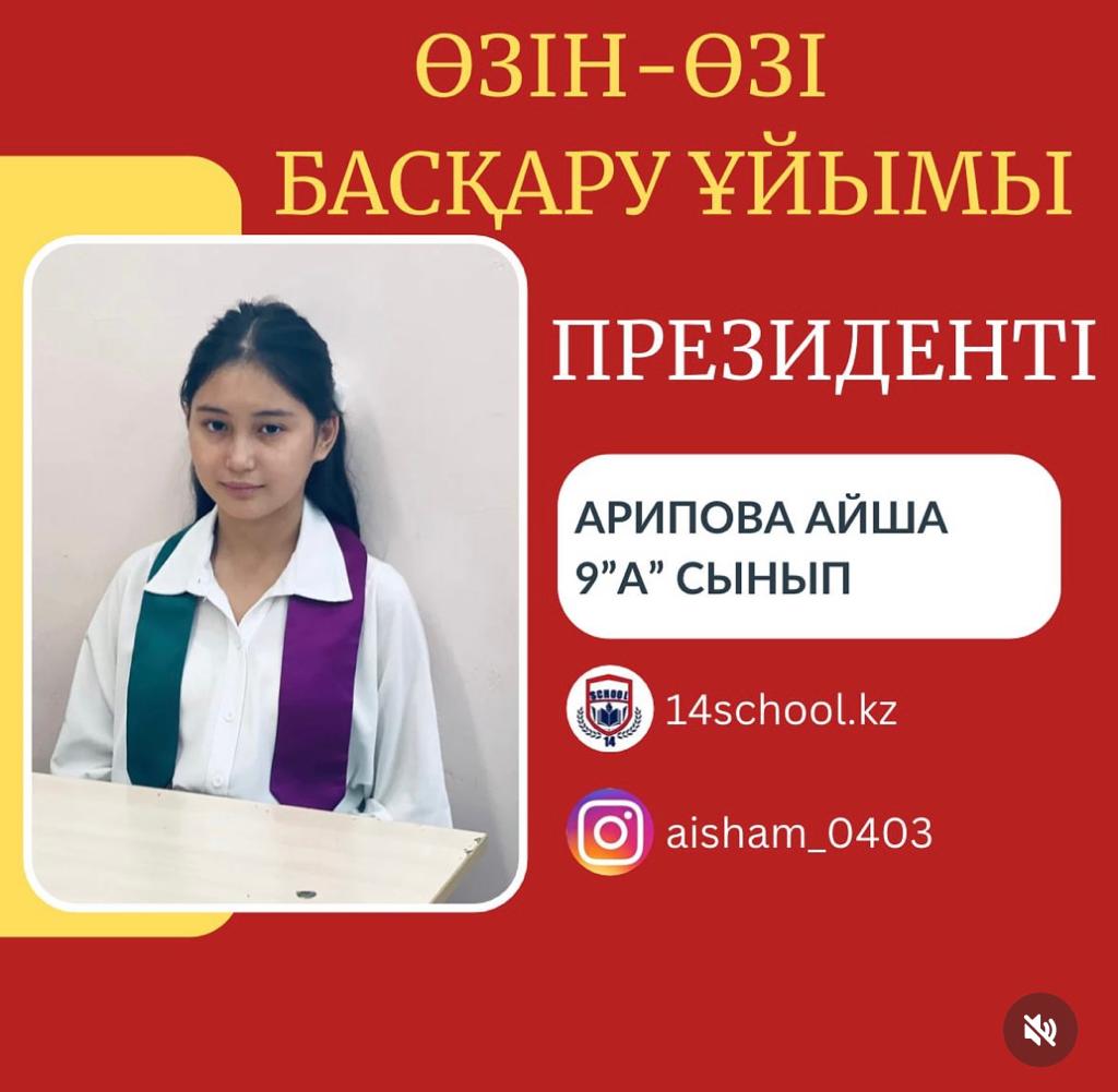 22 қараша 2023 0 1 2 3 4 5 Өзін-өзі басқару ұйымының „Президенті” Арипова Айша Болатқызы 9 „А” сынып оқушысы Мақсатым: ✅Салыстырмалы түрде мектептің деңгейін көтеру. ✅Окушыла Осы беттің QR-коды:QR-код этой страницы: