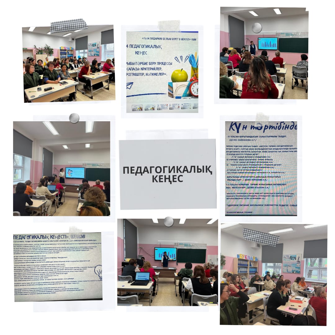 2025 жылғы 28 наурызда №14 жалпы білім беретін мектепте кезекті №4 педагогикалық кеңес өтті. Кеңестің басты тақырыбы – «Тәрбие беру процесінің сапасы: критерийлер, көрсеткіштер, нәтижелер».