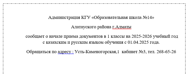 18 сәуір 2025 0 1 2 3 4 5 Администрация КГУ «Образовательная школа №14» Алатауского района г.Алматы сообщает о начале приема документов в 1 классы на 2025-2026 учебный год с Осы беттің QR-коды:QR-код этой страницы: