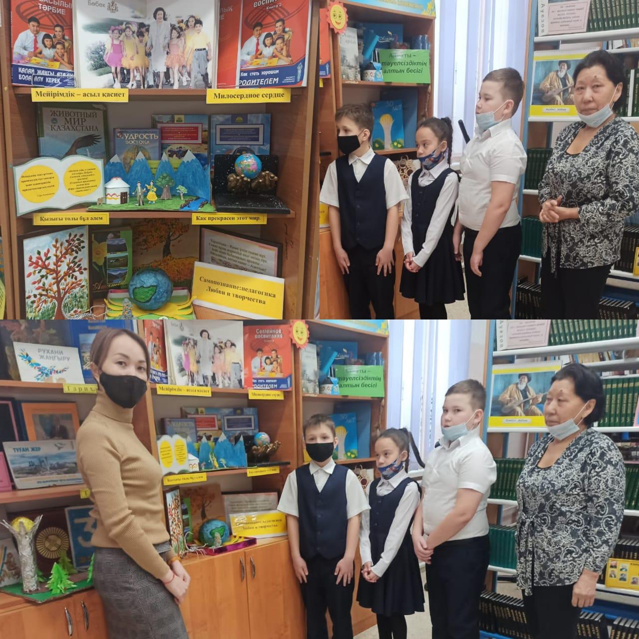 02.02.22 г. в рамках декады библиотекарь Молдабаева К. в школьной библиотеке организовала книжную выставку «Мейірім төгетін ана» о деятельности автора программы нравственно-духовного образования «Самопознание» С.А. Назарбаевой.