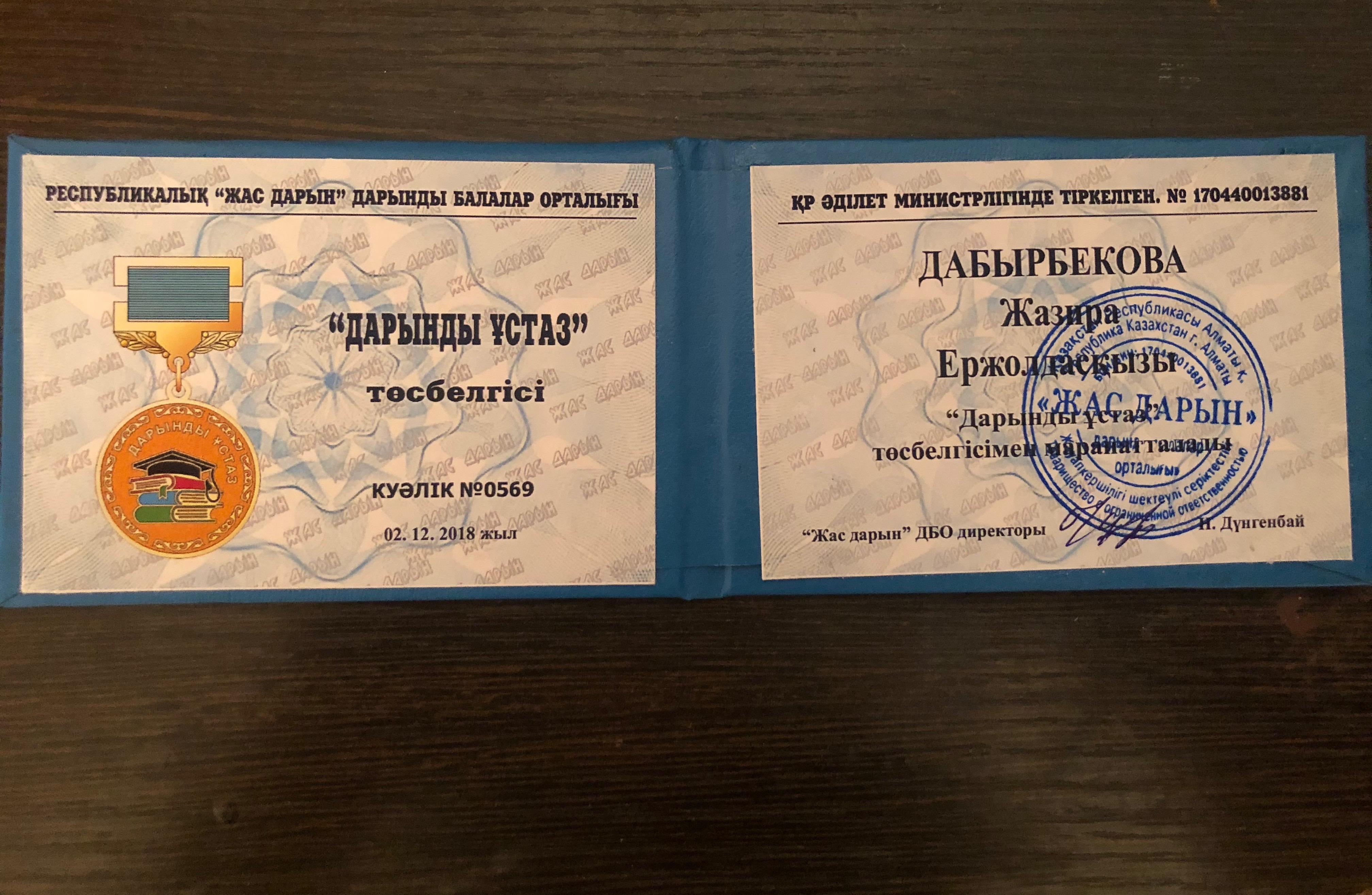 04 қаңтар 2019 0 1 2 3 4 5 Білім саласындағы жеткен жетістіктері, шәкірт тәрбиелеудегі елеулі еңбегі мен өз мамандығы алдындағы адал еңбегі үшін "Дарынды Ұстаз" төсбелгісі Осы беттің QR-коды:QR-код этой страницы: