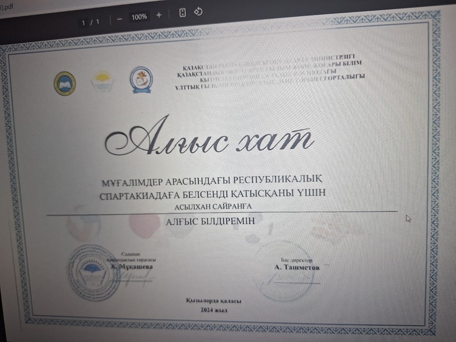 18.10.2024 года в г.Алмате, прошла спартакиада учителей по следующим видам спорта /тогыз кумалак, настольный теннис, волейбол, футбол, бес тас, асык ату/. Наши учителя физической культуры Байсадыкова Т.М. и Асылхан С.А. участвовали на спартакиаде. И заняли призовые места, получили путевку на республиканскую спартакиаду учителей которая проходила в г.Кызылорде с 28 октября по 4 ноября 2024 года.