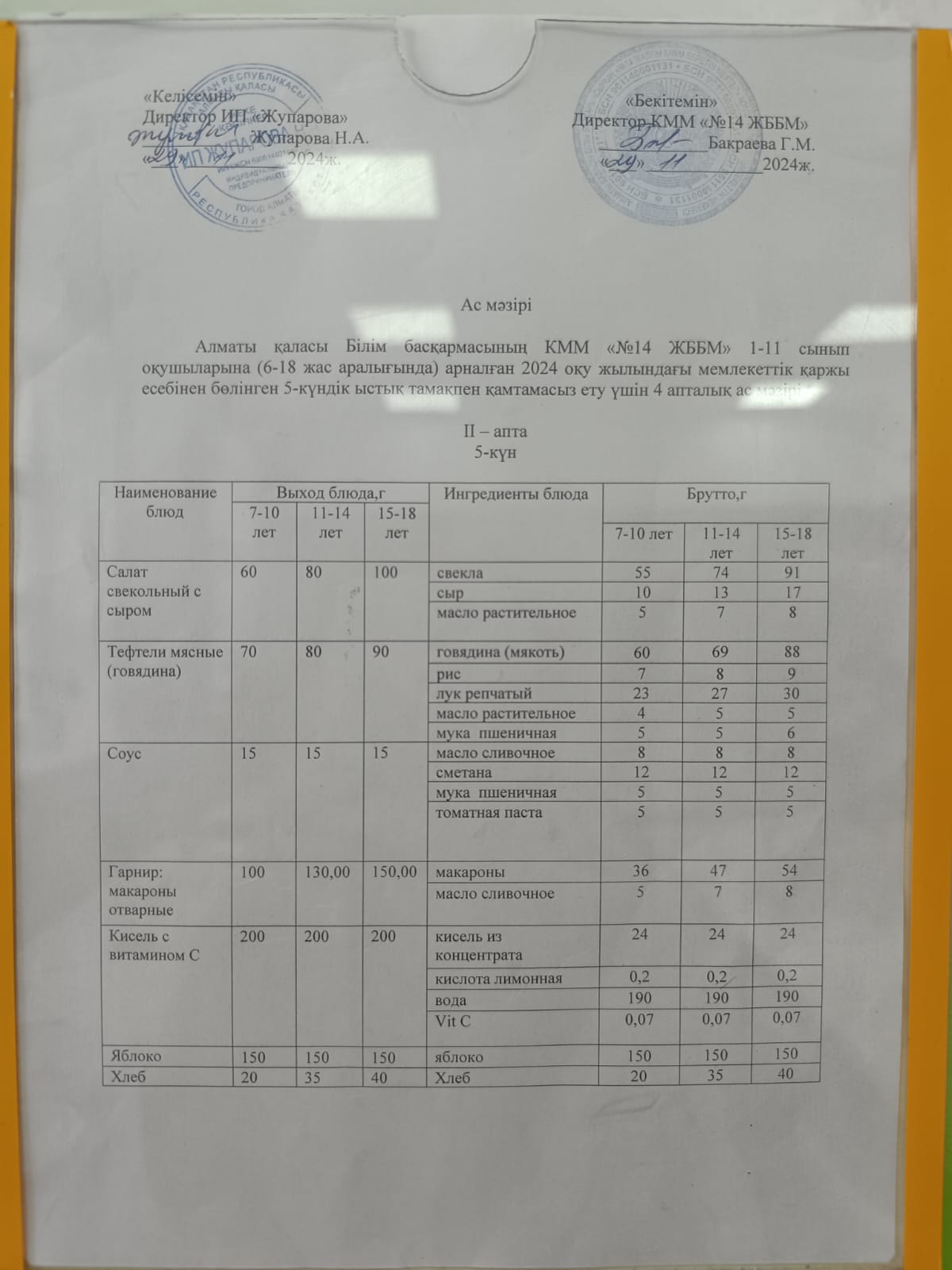 Ас мәзірі 14.01.2025ж.