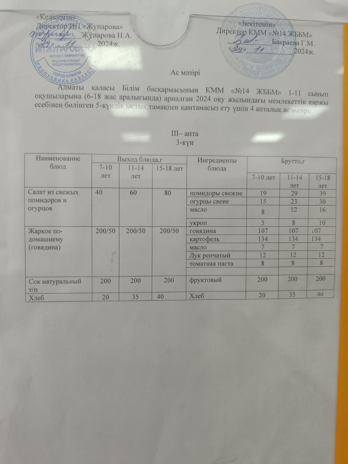 Ас мәзірі 14.01.2025ж.