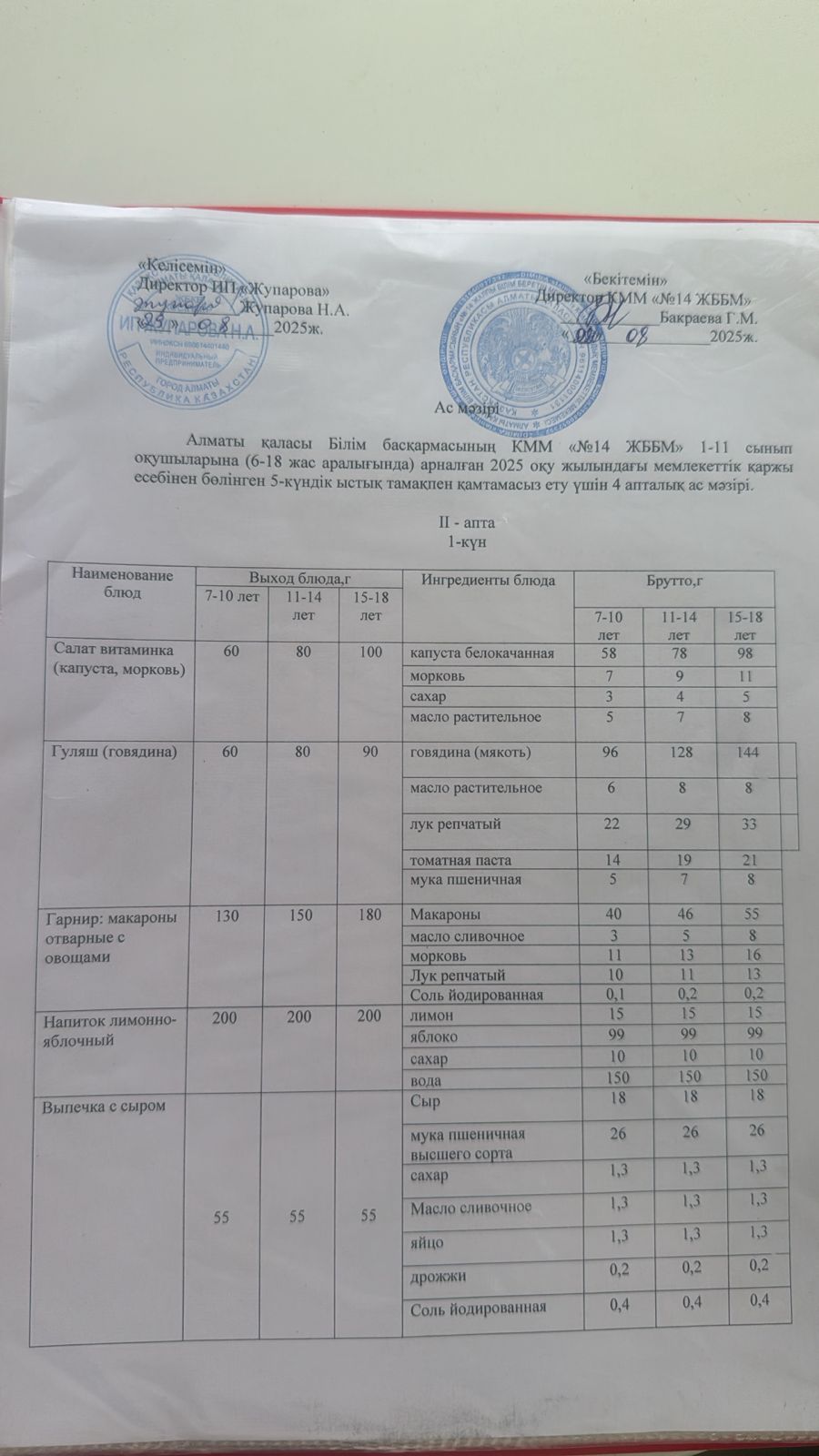 Ас мәзірі 30.05.2025ж. жазғы лагерь