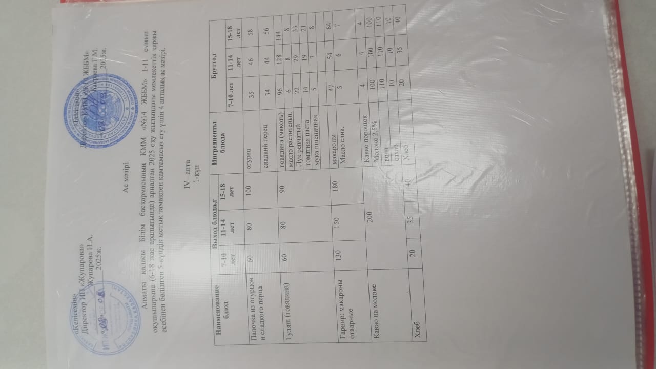 Ас мәзірі 30.05.2025ж. жазғы лагерь
