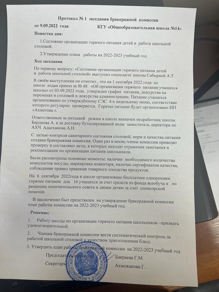 Протокол №1 заседания бракеражной комиссии