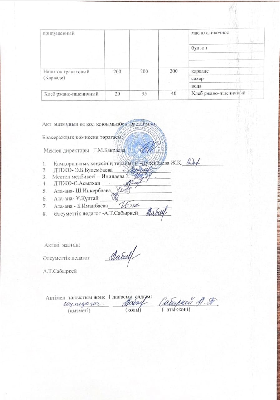 Тамақтану сапасын бақылау бойынша неке комиссиясының мектеп асханасын тексеру актісі 15.09.22ж