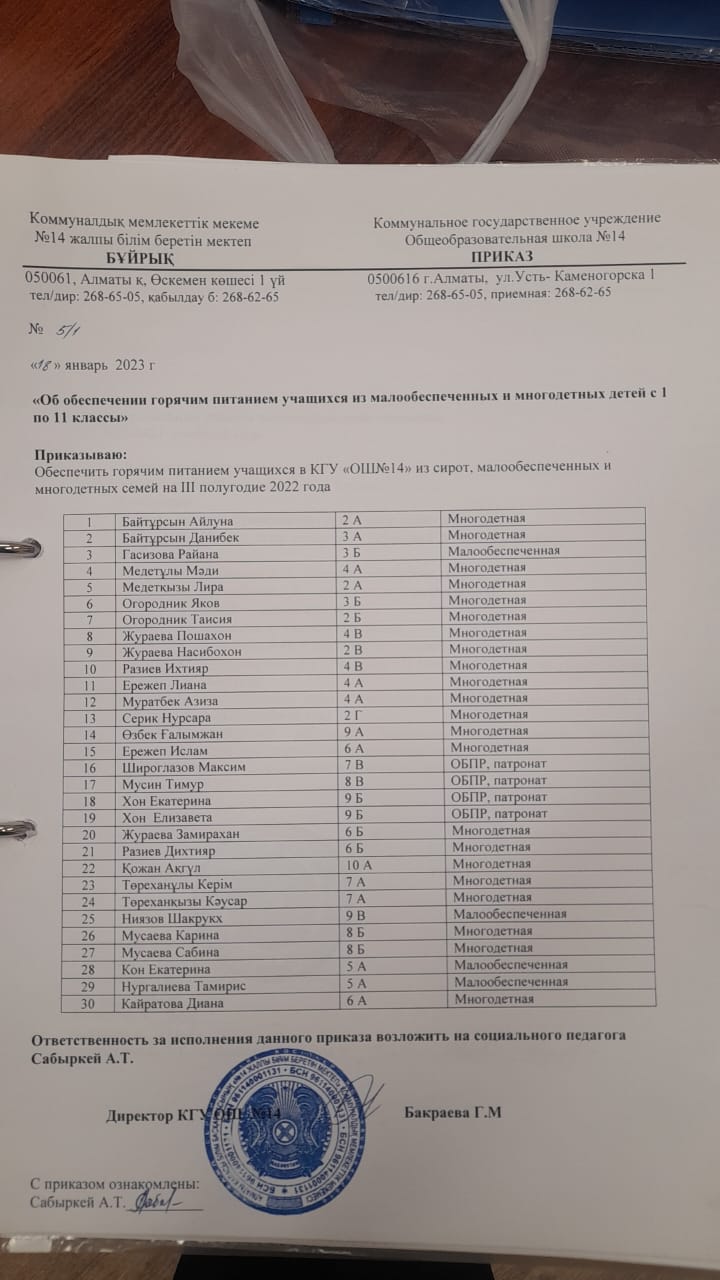 1-11 сыныптар аралығындағы аз қамтылған және көп балалы балаларды ыстық тамақпен қамтамасыз ету туралы бұйрық