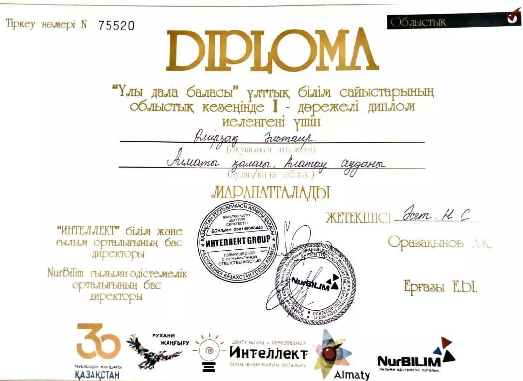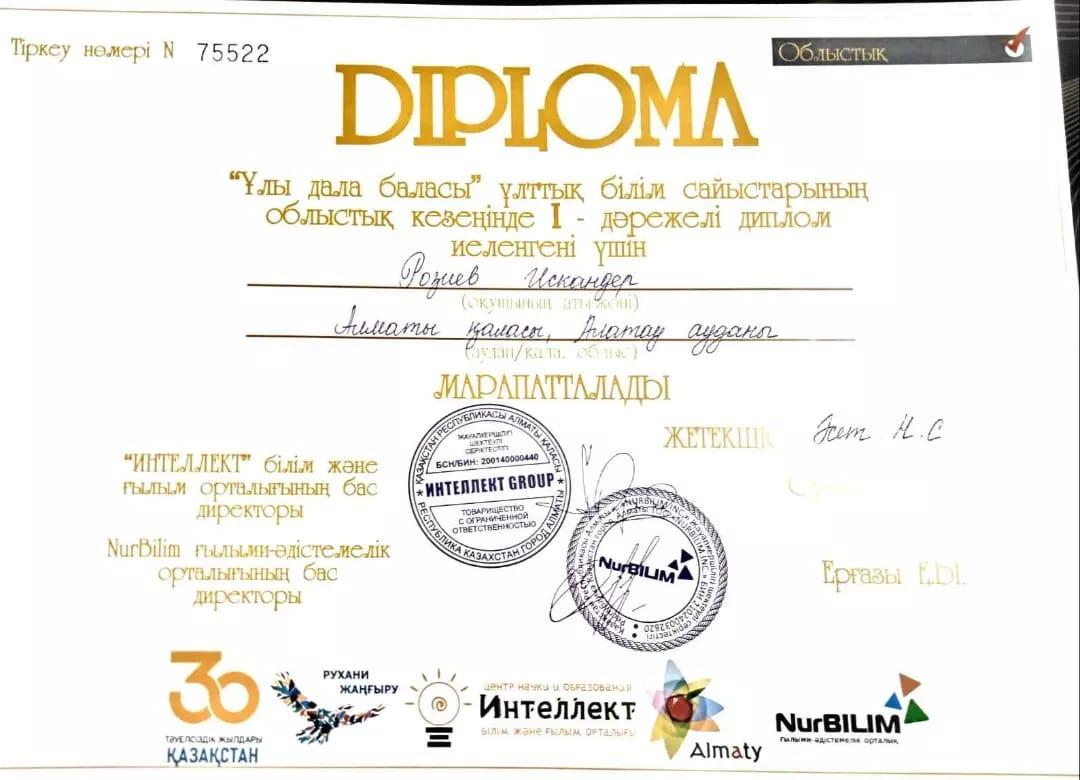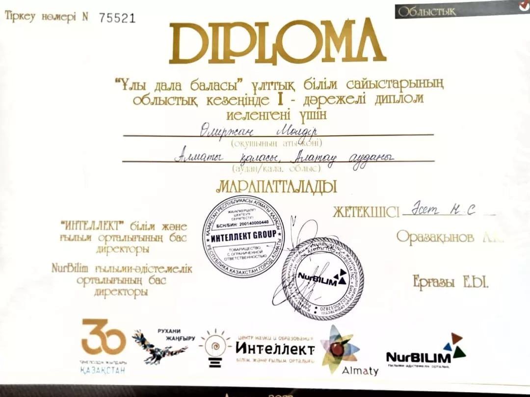 18 ақпан 2022 0 1 2 3 4 5 "Ұлы дала баласы" 1-орын. Өміржан Мөлдір. 1-орын. Өмірзақ Әльтаир. 1-орын. Розиев Искандер. Ұлы дала баласы" ұлттық білім сайыстарының облыстық кезеңіне жетіп мектебіміздің оқушылары өз білімдерін көрсетті.1-орын. Өміржан Мөлдір.1-орын. Өмірзақ Әльтаир.1-орын. Розиев Искандер.Жетекшісі: Ағылшын тілі пәнінің мұғалімі Әсет Нұрай. Осы беттің QR-коды:QR-код этой страницы: