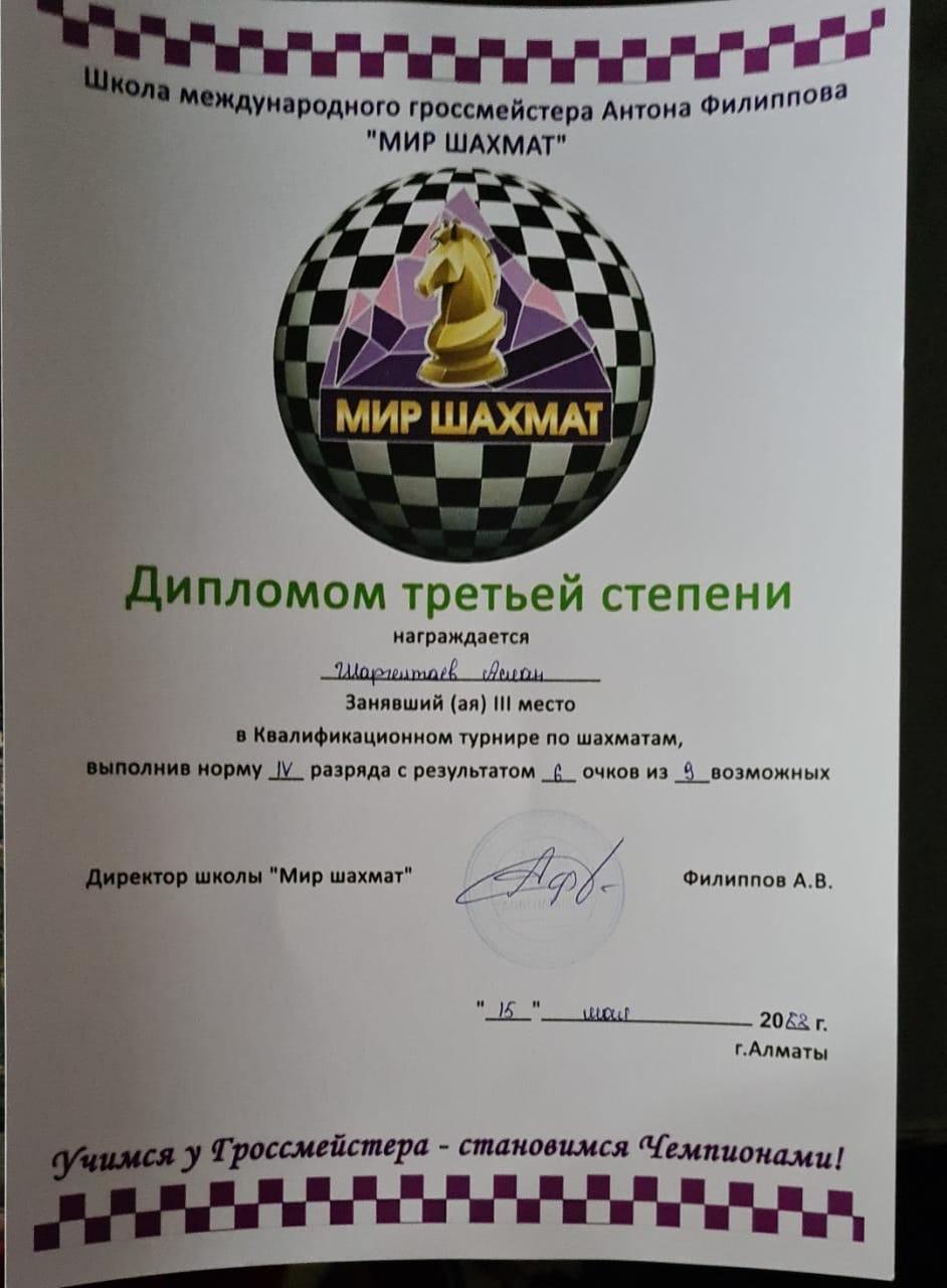 6 "А" сынып оқушысы Шаргелтаев Аслан Алматы қаласында өткізілген шахматтан 4 разряд бойыша 3- орын иеленді.