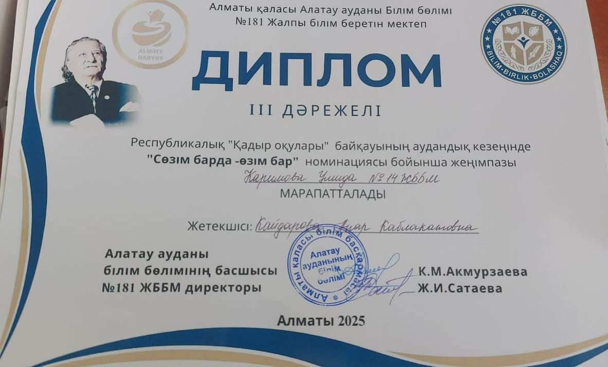 Осы аудандық жыр сайысының " Сөзім барда-өзім бар" номинациясы бойынша Каримова Умида III-ДӘРЕЖЕЛІ дипломмен марапатталды. Пән мұғалімі Кайдарова Анар Каблакатқызы